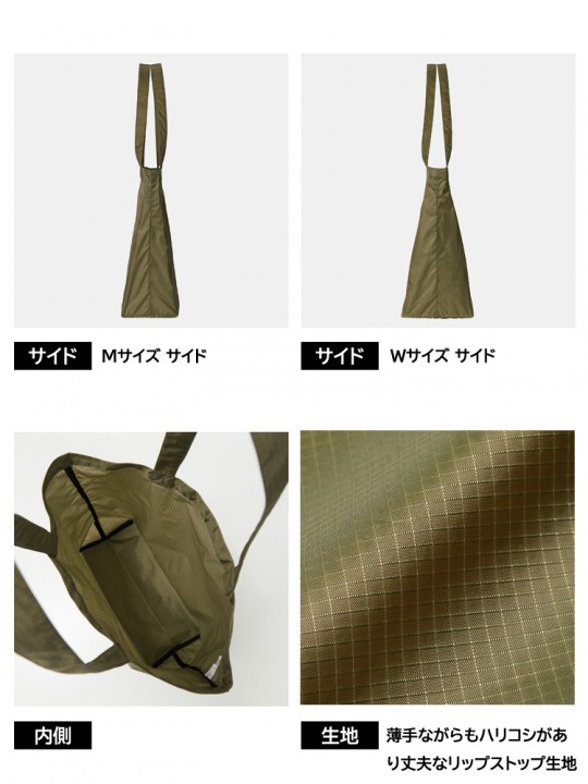 軽くてタフなリップストップ生地のトートバッグ。裏地にはアクリルコーティングを施していて耐久性も◎ 普段使いしやすいMサイズと、たっぷり38L入るWサイズの2タイプ。カラーは明るめから落ち着いた色まで揃った8色展開です。