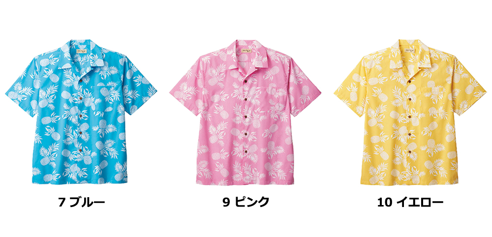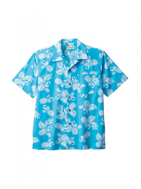 歓迎や幸運の象徴とされるパイナップル柄をあしらったアロハシャツ。明るく元気な印象で、コーデの主役として取り入れやすい一枚です。カラーは爽やかなブルー、かわいいピンク、華やかなイエローの3色展開。左胸ポケット付きで実用性もあり、襟は開襟仕様ながらボタンを留めて着ることも可能。きちんとした印象にも対応します。