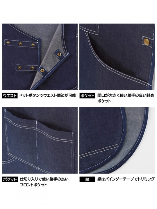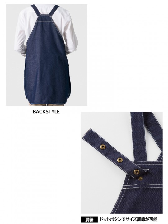 オーバーオール風のデザインが特徴のデニム調エプロン。カジュアルな雰囲気があり、作業用としても取り入れやすい一枚です。肩紐とウエストはドットボタンで調節でき、体型や着用シーンに合わせやすい仕様。フロントには仕切り入りポケットと斜めポケットを備え、道具の出し入れもスムーズです。動きやすさを意識した、作業にぴったりのエプロンです。
