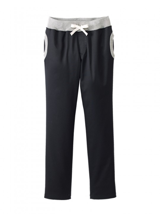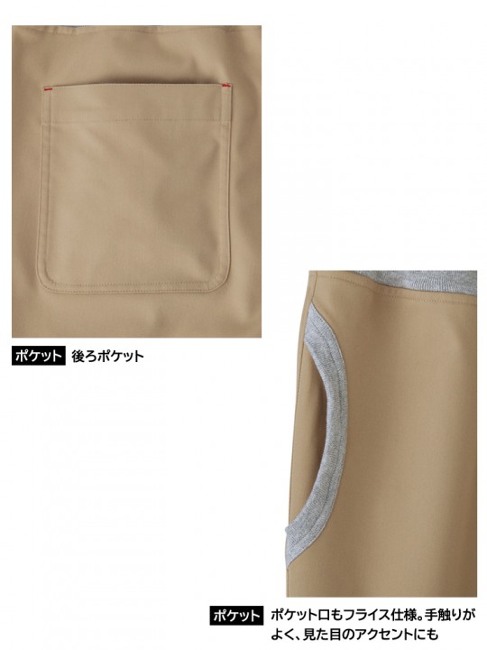 動きに合わせて伸びる生地感で、ウエストはゴム仕様のため、リラックスしたはき心地が続きます。ポケット口にはフライス素材を取り入れ、シンプルな中にかわいらしいアクセントをプラス。