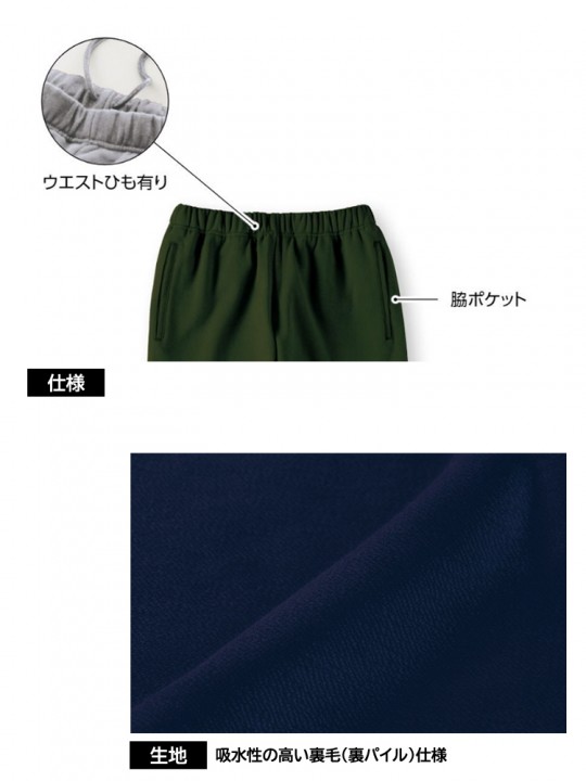 程よい厚みの裏毛スウエットパンツは裏はタオルなようなパイル地になっているので肌ざわりがよく、吸水性もよいのが人気です。